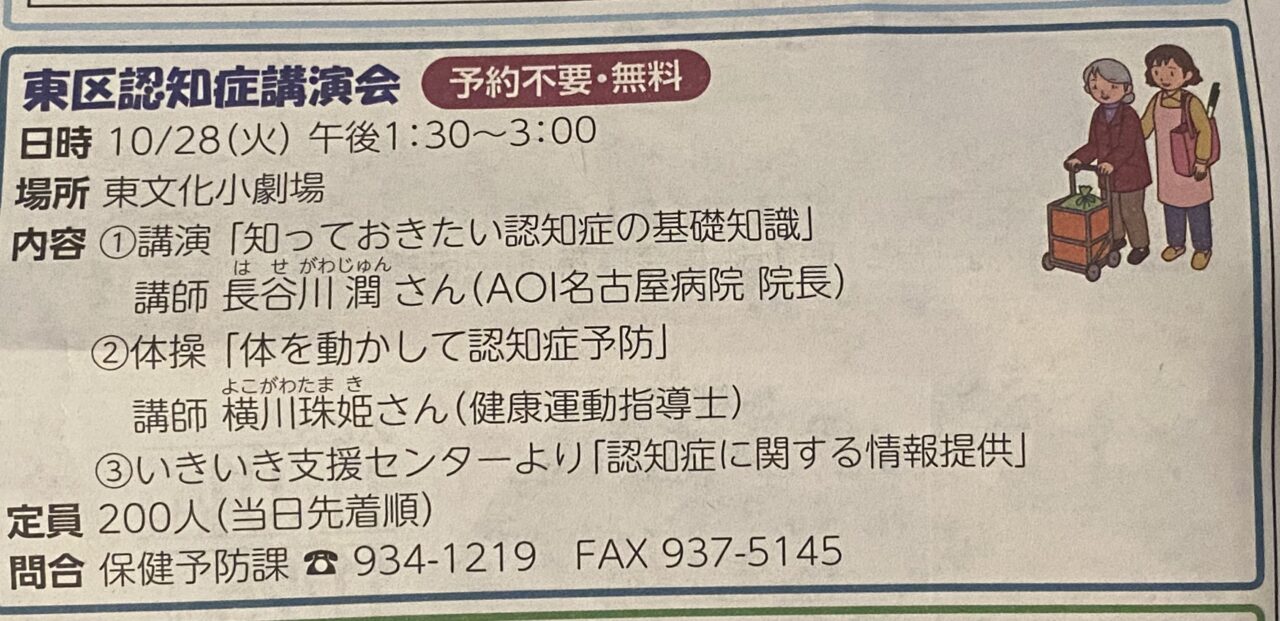 【名古屋市東区】10/28「東区認知症講演会」開催!予約不要・無料で参加OK
