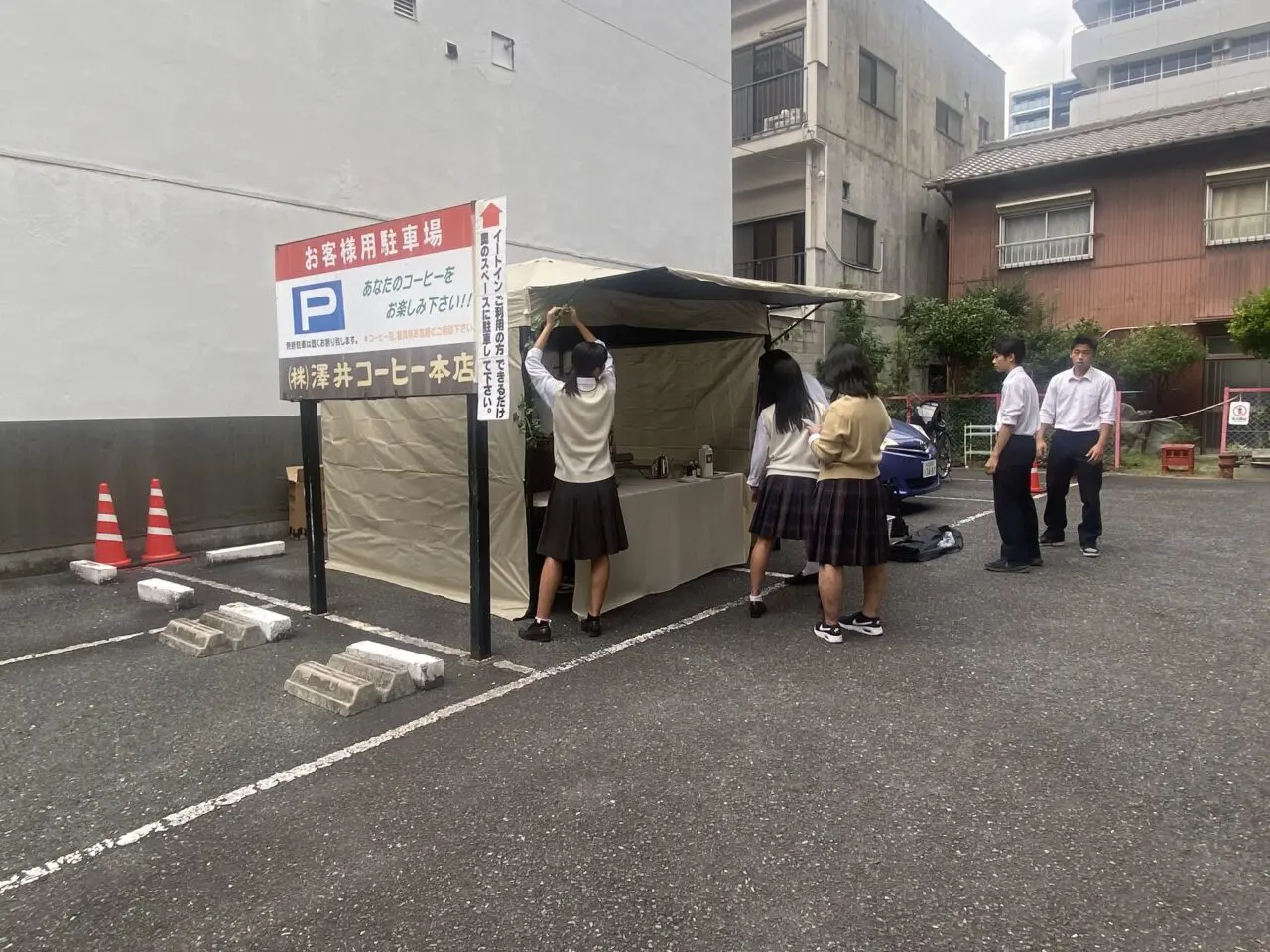 2025年10月10日(金)、東区泉2丁目にある「澤井コーヒー本店」駐車場で、「なごやかまつり・ひがし」コラボ出店に向けたハンドドリップの模擬演習が行われました。参加したのは、愛知商業高校の学生たち。