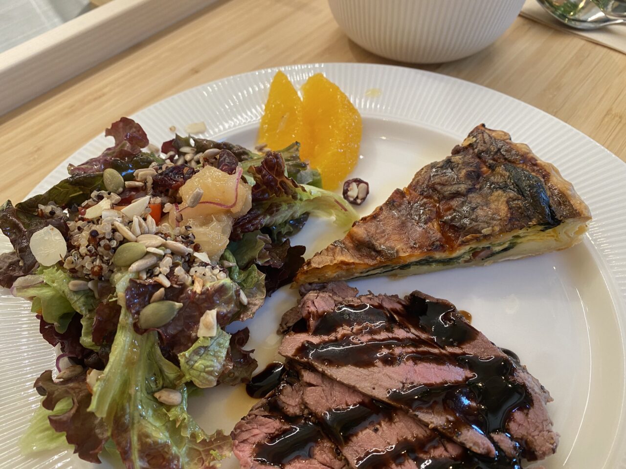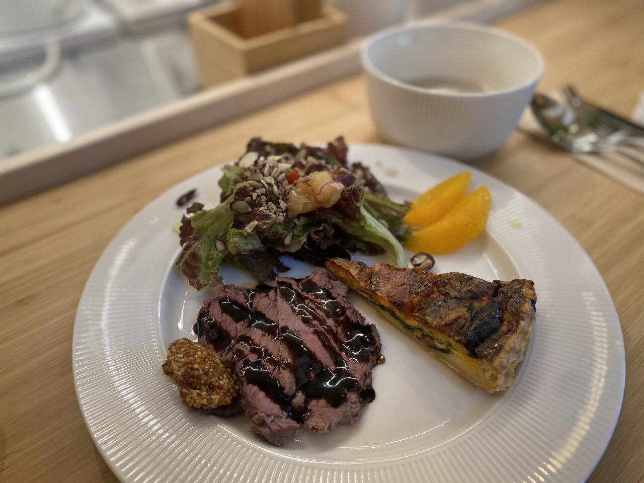 ナッツのがふんだんにかけられたサラダとキッシュ、ローストビーフ!お肉にかかったソースがこれまた美味でした。