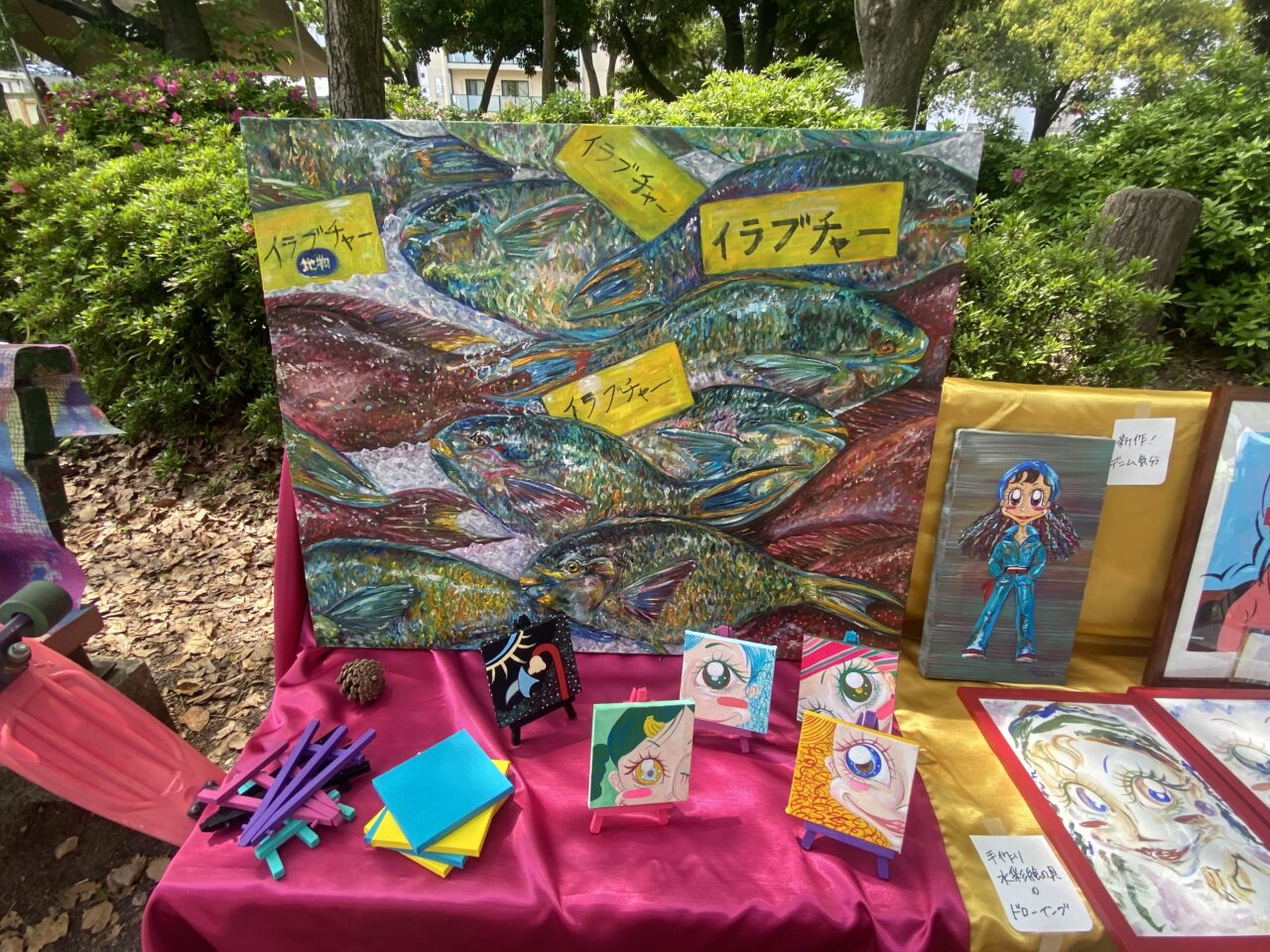 ミーサさんは、2025年4月に東区「建中寺公園」で開催された「こどもとあそべるマーケット」にも出展されていました。ギャルテイストなカラフルなアートに目が奪われます♪