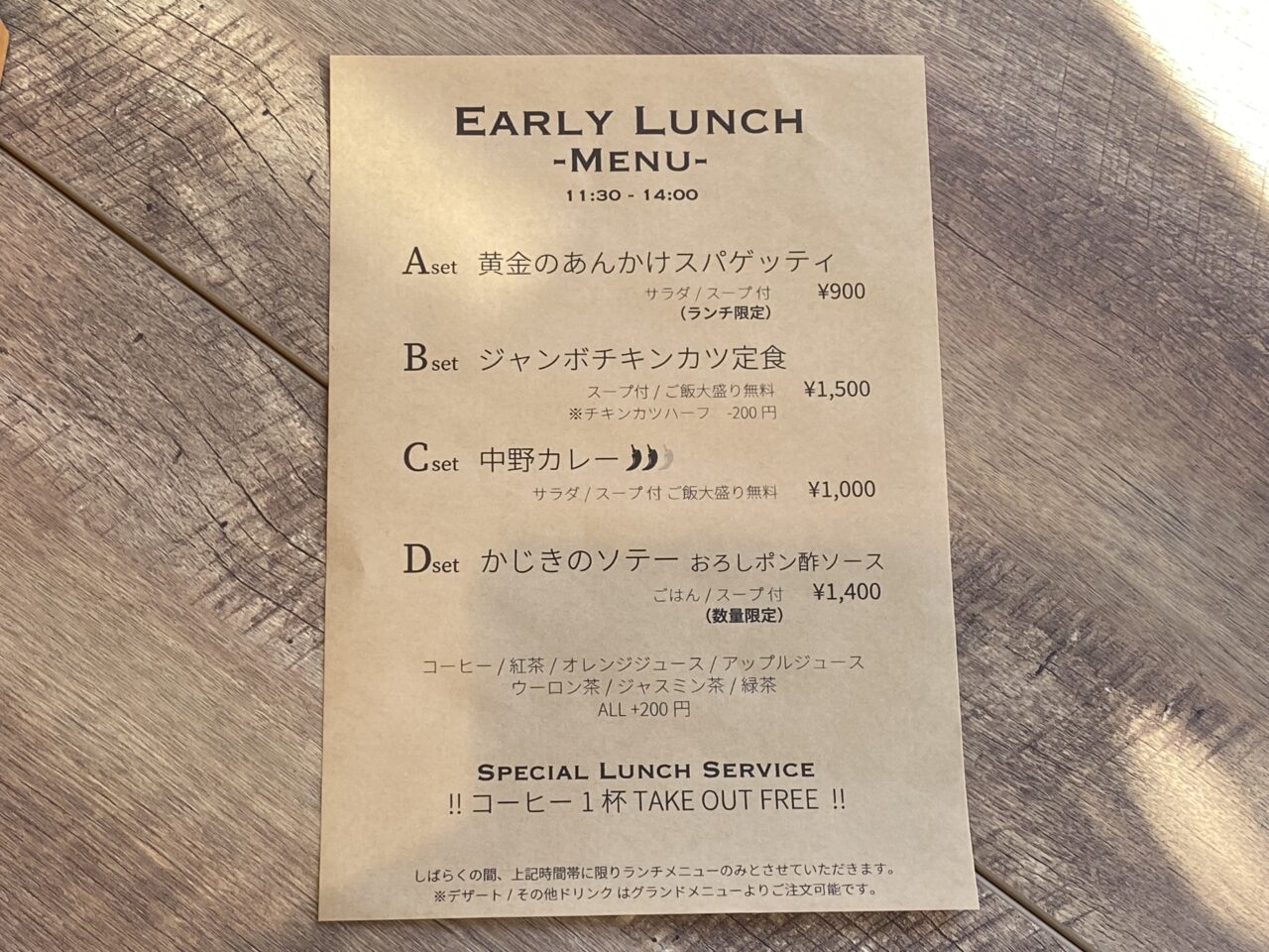 そして、ランチメニュー注文するとなんとコーヒーのテイクアウトが無料に!しかも提供するコーヒーは同じく東区にある老舗珈琲店「澤井コーヒー本店」が「アーリーカフェ」オリジナルブレンドを監修しています。