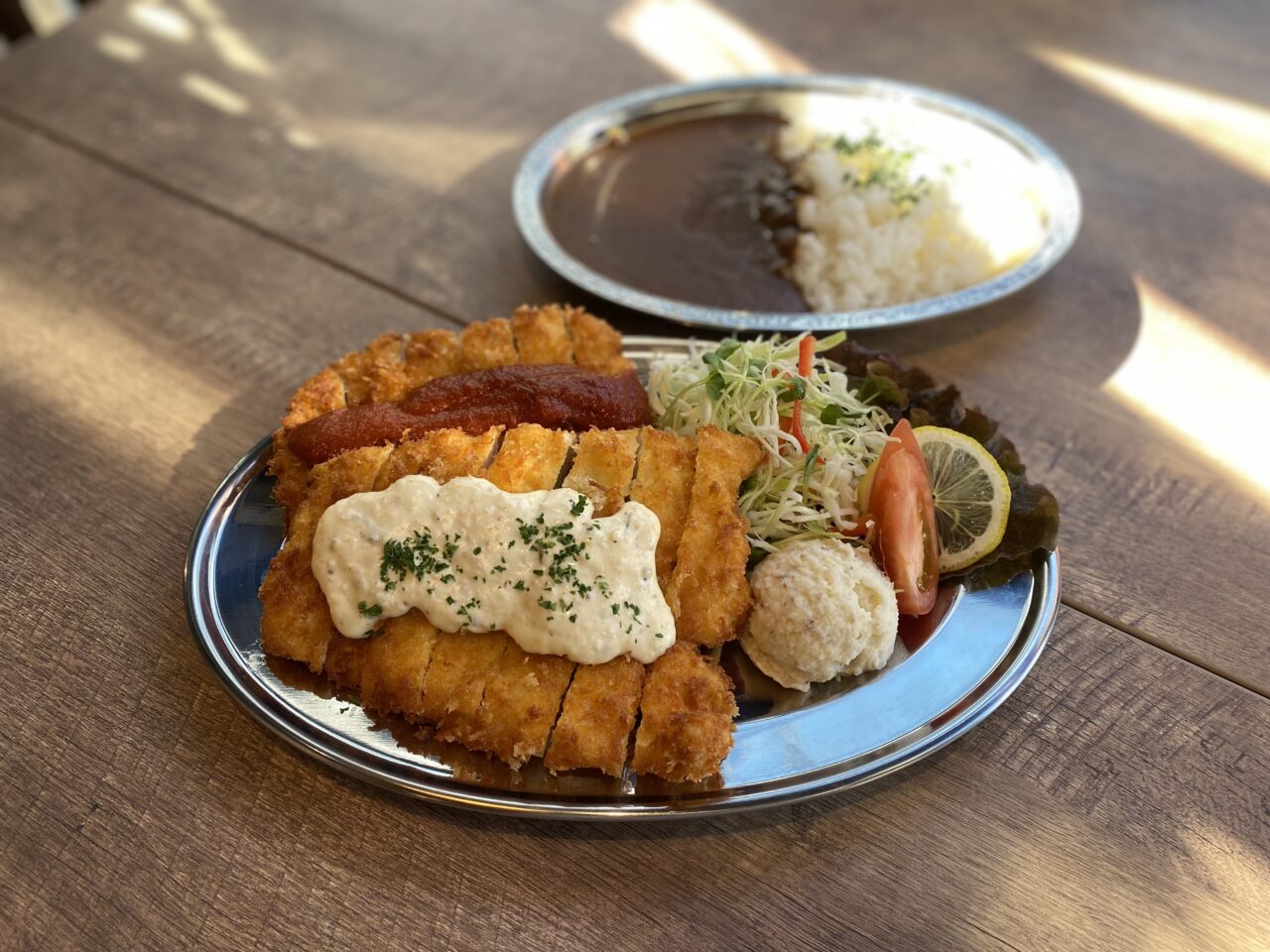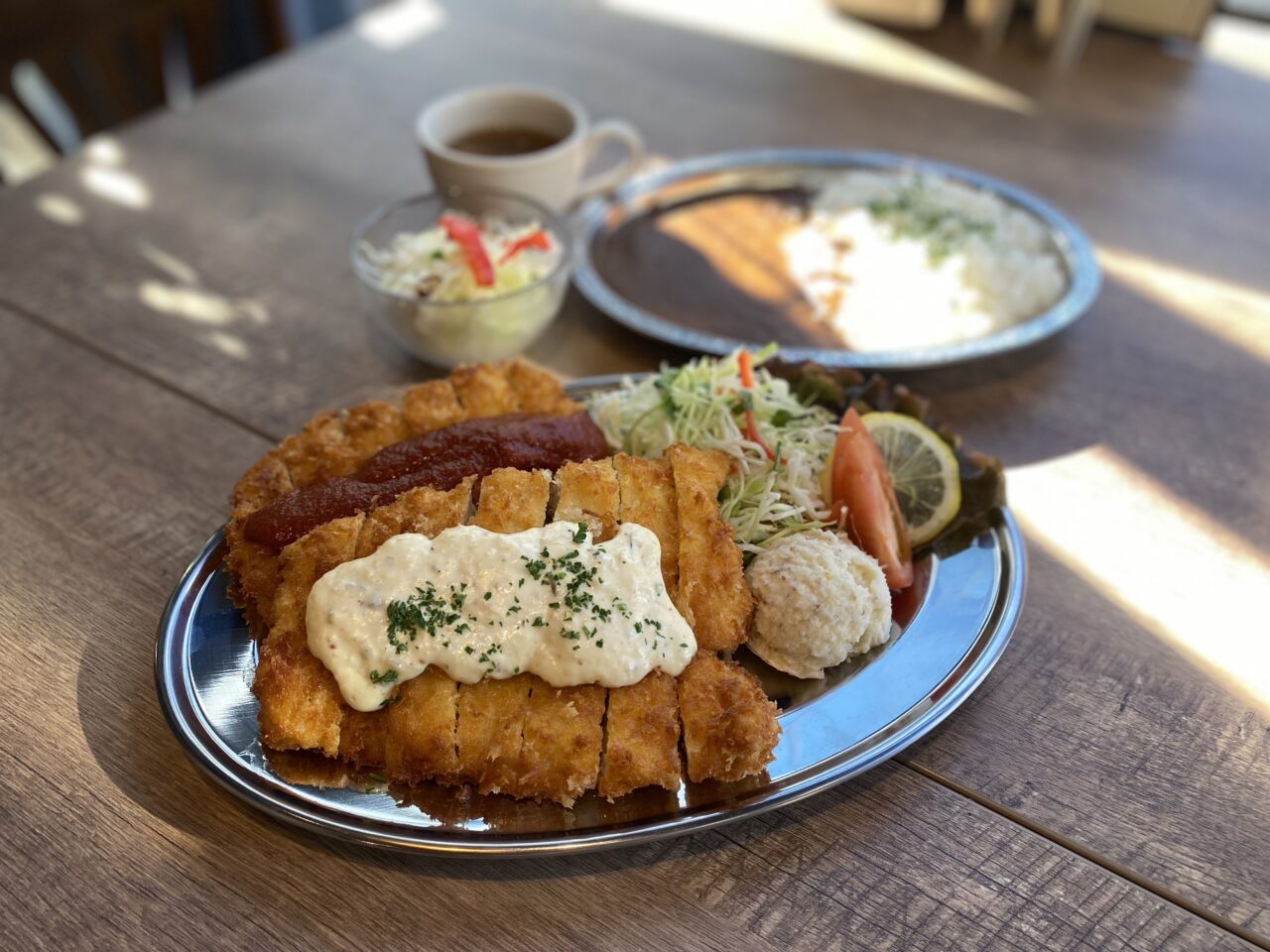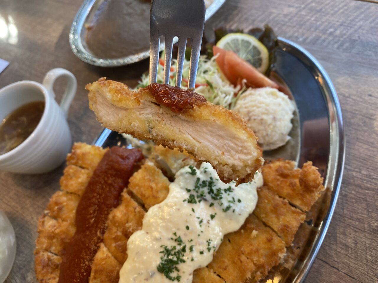 サクッと軽い衣に、柔らかなお肉、さらにタルタルソース&トマトソースの2種なので二度美味しい!ランチタイムは ご飯とスープ(この日はオニオン)のセット価格(税込1,500円)で提供。見ての通りボリューミーなのですが、美味しくてペロリと平らげてしまいました。