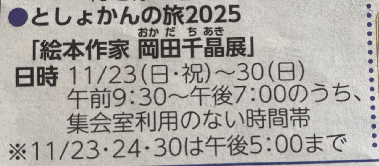 名古屋市東区の「東図書館」で、2025年11月23日(日・祝)〜30日(日)まで「絵本作家 岡田千晶展」が開催されています!