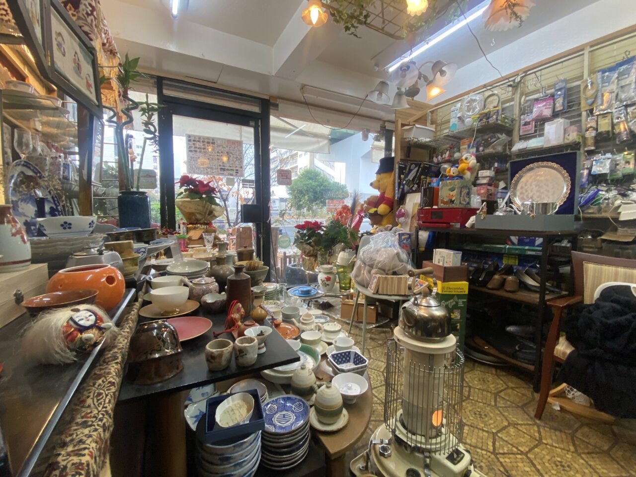 その名も 「ヒノモトジャパン(ニシムラデンキ)」。店頭には電気屋の小さな看板があるのに、店内(店頭も!)には、圧倒的物量のアンティーク、食器、絵、古着、ヴィンテージ雑貨などが所狭しと並び、初めて訪れた人が必ず思わず二度見してしまう……そんな存在感のある店です。