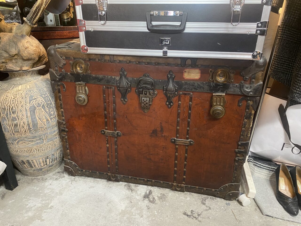 白壁の大学関係者のお宅の蔵から出てきたもので、飛行機がない時代、海外との貿易で使われていた“本物の船旅の箱”だそうです。