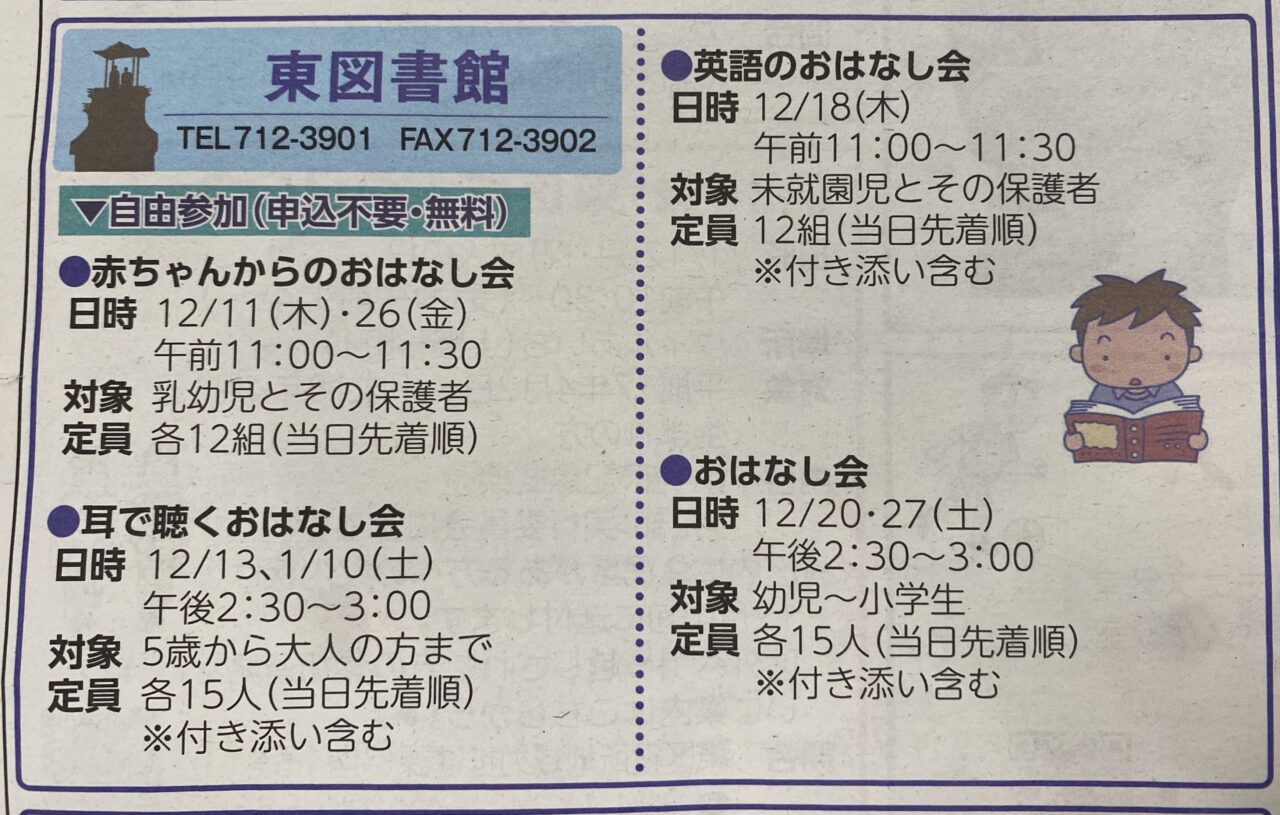 名古屋市東区にある「東図書館」で、12月も子ども向けの楽しいイベントが多数開催されます。