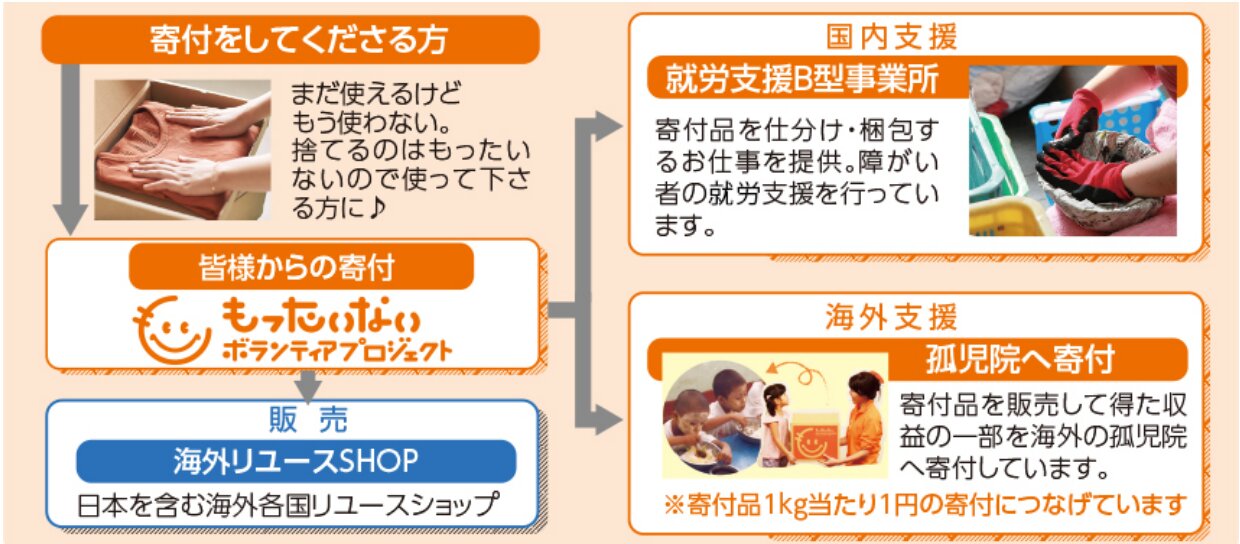 寄付されたものは国内外でリユースされ、また誰かが大切に使ってくれるそう。さらに、そこで得られた収益で障がい者の方の就労自立支援、海外孤児院で暮らす子どもたちの自立支援にもつながります。