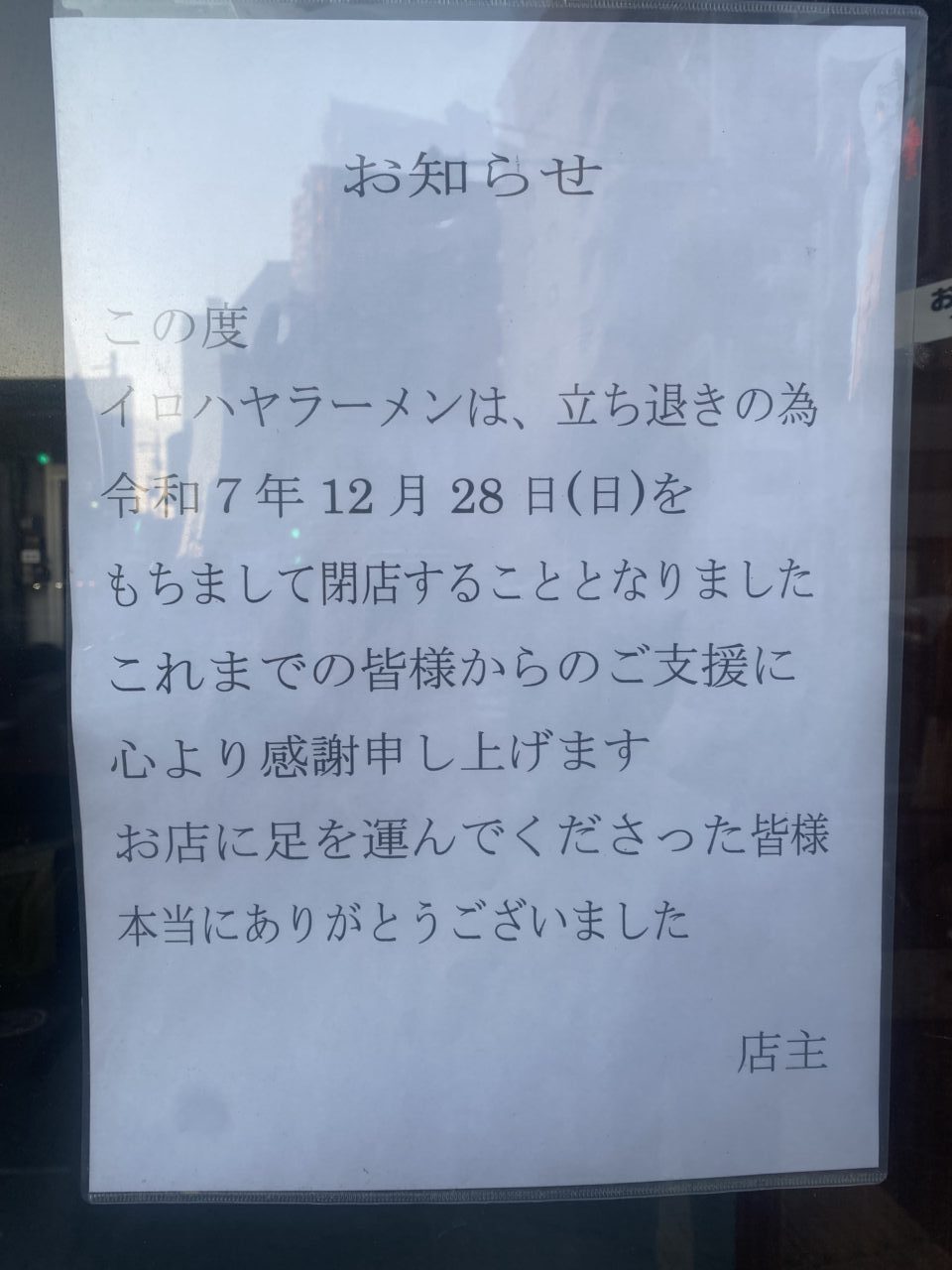 掲示によると、立ち退きのため、2025年12月28日(日)をもって閉店とのこと。これまでお店に足を運んだ方へ向けて、感謝の言葉も添えられていました。