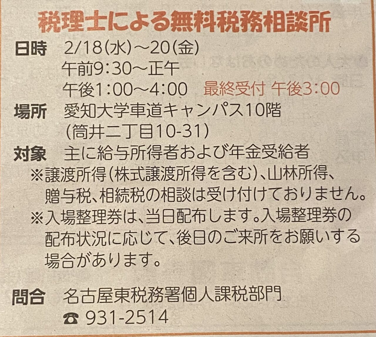 問い合わせ:名古屋東税務署 個人課税部門(TEL:931-2514)